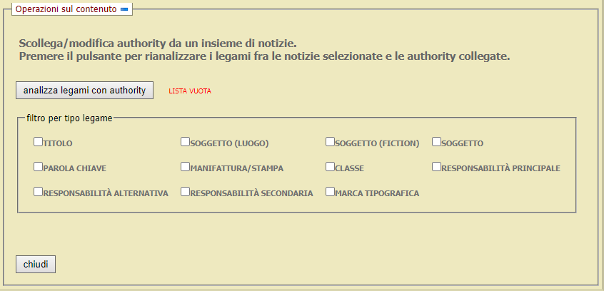 Scollega authority, permette di slegare i dati di autorità prescelti da tutte le notizie dello scaffale