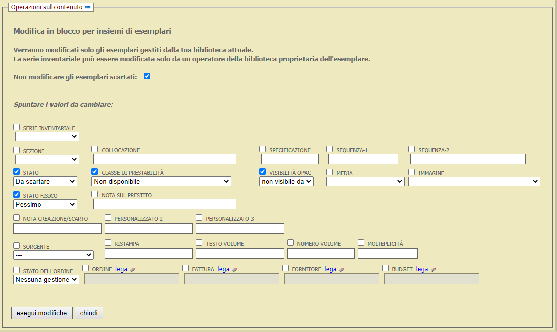 Modifica in blocco alcune informazioni gestionali di un insieme di esemplari appartenenti alla biblioteca attuale.