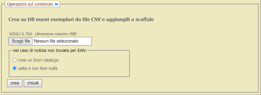 Selezionando l’opzione Crea un fuori catalogo è possibile creare un esemplare fuori catalogo nel caso non si trovasse nel catalogo una notizia con l’EAN indicato.