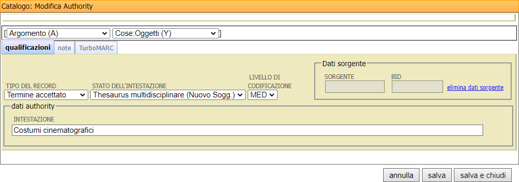 Le qualificazioni cambiano in base al tipo di authority selezionata, di seguito si elencano tutti i metadati:
