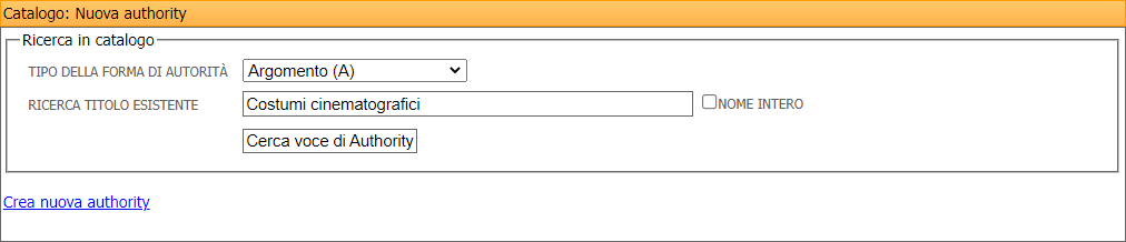 Come per la creazione di notizie, viene richiesto un controllo all’interno della Lista authority della presenza dell'authority che si vuole creare. Nel caso la ricerca non producesse risultati, viene data la possibilità di cliccare il link Crea nuova authority.