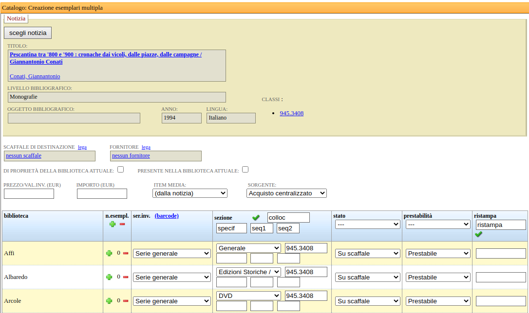 Se si clicca Creazione esemplari multipla dal menù sarà necessario individuare la notizia a cui associare gli esemplari. Questa operazione può essere fatta utilizzando il tasto Scegli notizia e poi cliccando sull’azione Lega accanto alla notizia.