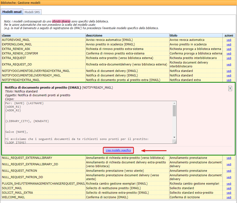 Come evidenzia la nota in cima alla tabella Per le azioni automatiche che non prevedono la scelta del modello usato (es. la mail di benvenuto a seguito di registrazione da OPAC) ha precedenza l'eventuale modello specifico della biblioteca.