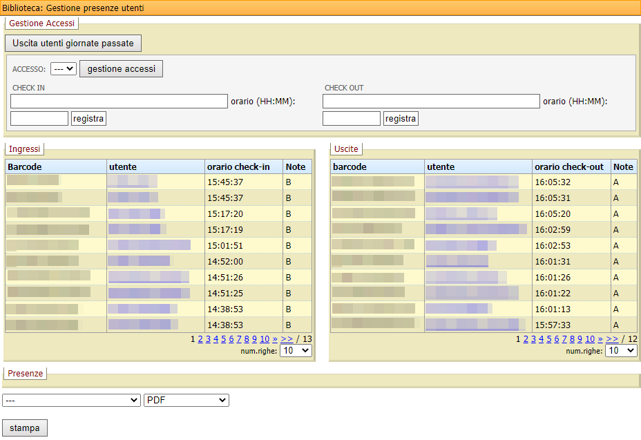 Le sezioni Ingressi e Uscite elencano rispettivamente tutte le azioni di ingresso e uscita degli utenti registrati nella giornata, riportando nella colonna Note il nome dell'accesso (se utilizzato e se più di uno) ed eventuali avvertimenti per diritti scaduti o non validi dell'utente stesso.