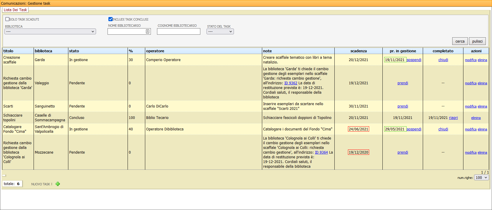 Questa pagina permette la creazione e la gestione di attività (task) assegnate ad uno specifico operatore o biblioteca (o entrambi), indicandone la percentuale di completamento (manualmente).