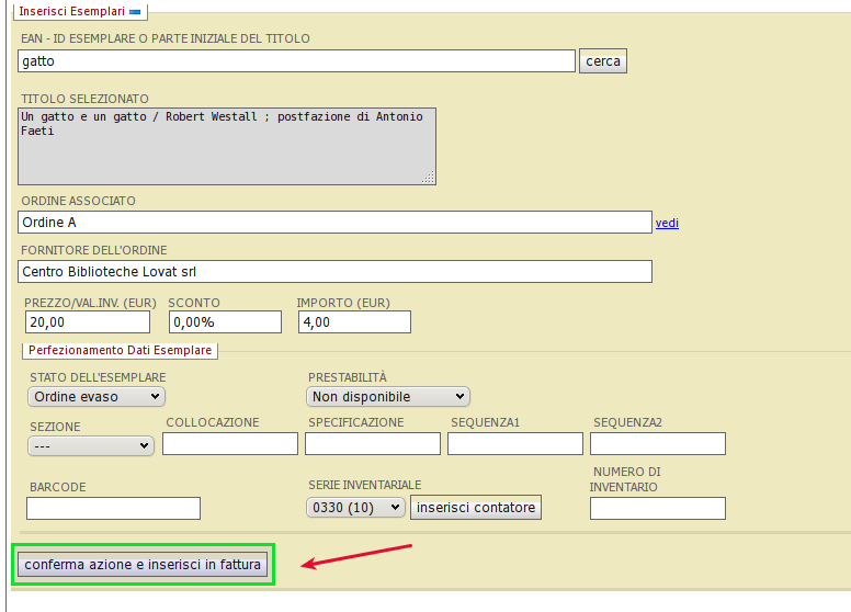 Nella pagina vedi fattura si trova un'area (nascondibile) utilizzabile per aggiungere esemplari ad una fattura (gli esemplari devono già essere presenti nell’ordine) :