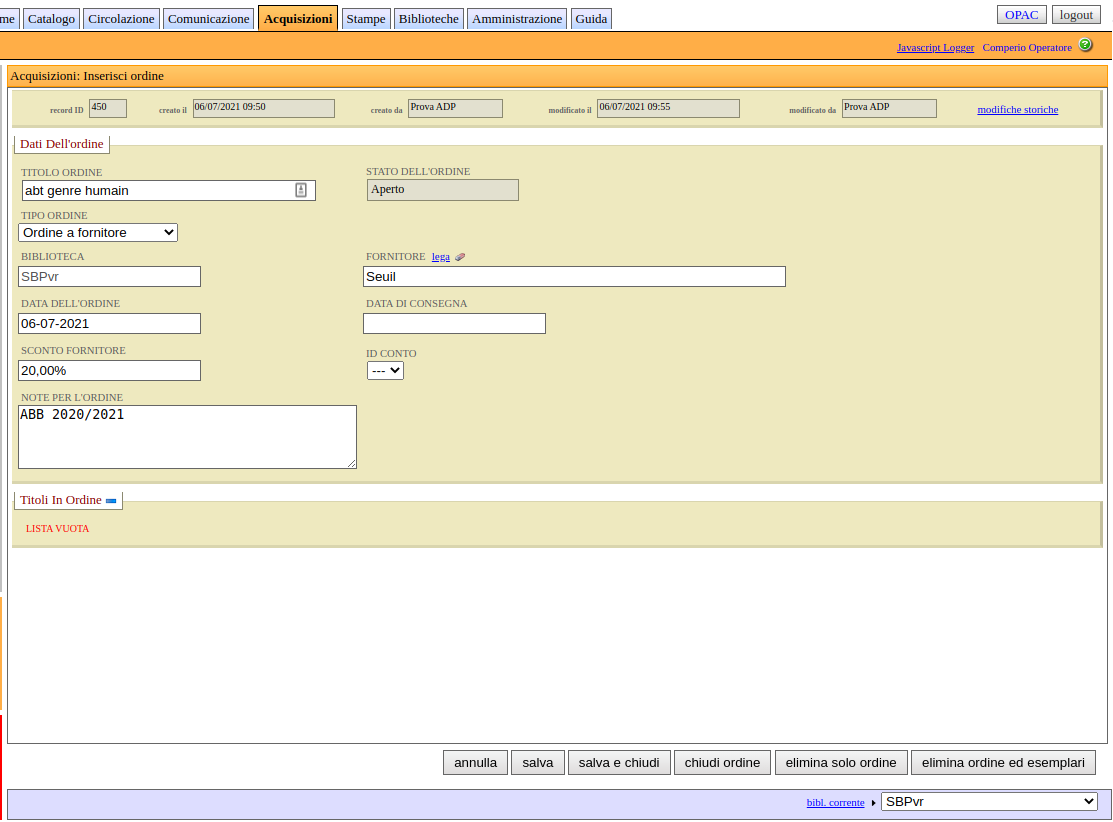 salva e chiudi, permette di salvare l'ordine e quindi procedere all'aggiunta di titoli dalla pagina di visualizzazione;
