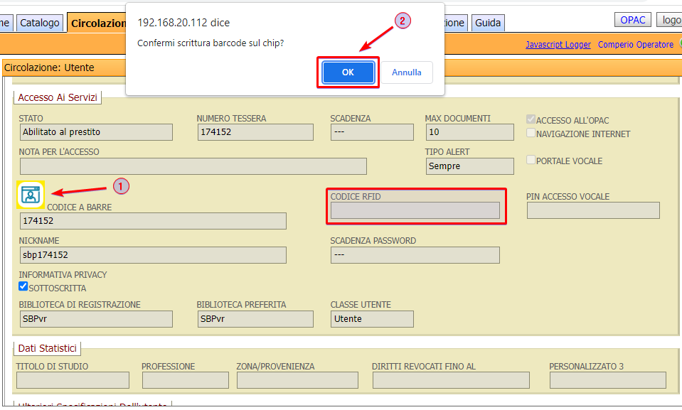 Quando si usa l’RFID in una pagina di circolazione interbibliotecaria (es.: interprestiti in entrata o in uscita) e si vuole passare a un’altra pagina, ad esempio banco prestiti, è opportuno non aprirla in un’altra scheda del browser. Il flag abilitato in banco prestiti (di dafault) abilita in automatico il flag in tutte le altre pagine aperte nello stesso browser, anche se è stato precedentemente disabilitato.