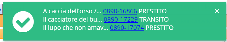 Se uno o più documenti letti dalla postazione RFID non sono presenti nella lista in cui si sta lavorando (ad esempio non sono presenti tra gli interprestiti in uscita), i titoli vengono segnalati in un messaggio di colore rosso.