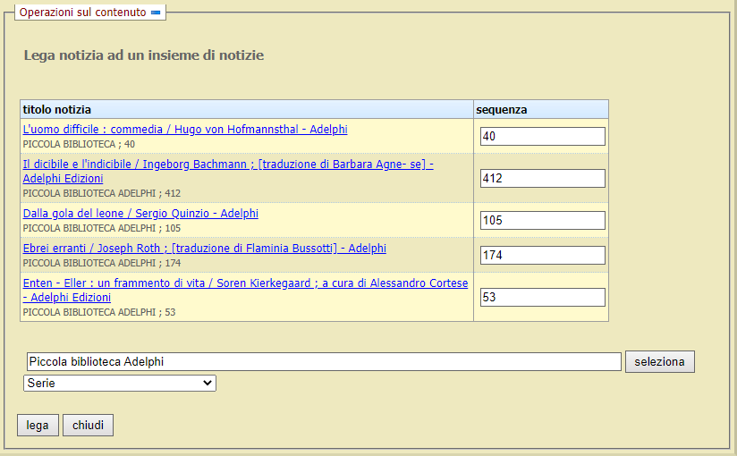 Attraverso il pulsante Seleziona è possibile ricercare e selezionare (da popup) una notizia da legare alle notizie contenute nello scaffale (attraverso l’azione Lega relativa al risultato). Per ognuna di queste, si può specificare una sequenza.