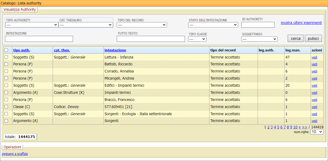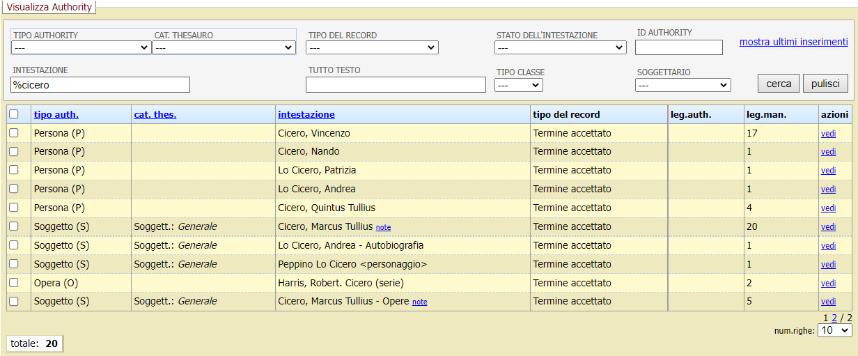 tipo auth. (tipo authority): riporta il tipo di authority (persona, ente, soggetto, ecc.); ordinabile cliccando sull'intestazione della colonna;