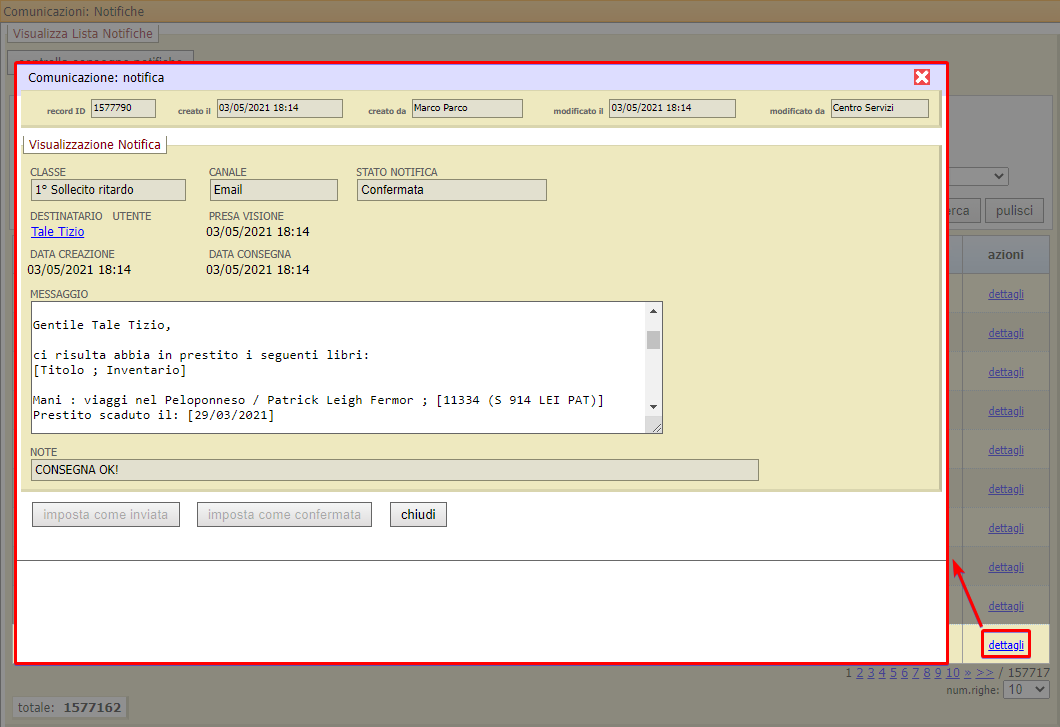 Cliccando l’azione Dettaglio è possibile visualizzare il dettaglio della notifica, il testo del messaggio o il nome del modello predefinito di notifica inviato.