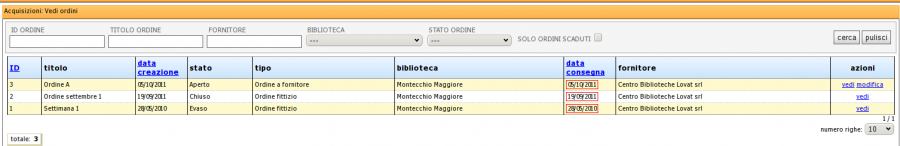 Biblioteca, permette di selezionare la biblioteca che ha creato l'ordine;