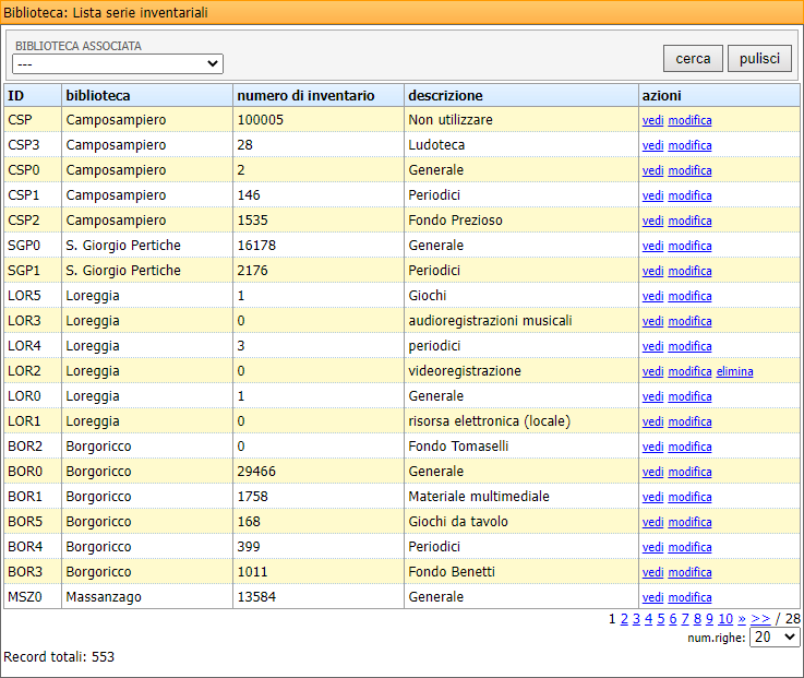 La pagina elenca le serie inventariali presenti nel sistema secondo i parametri: