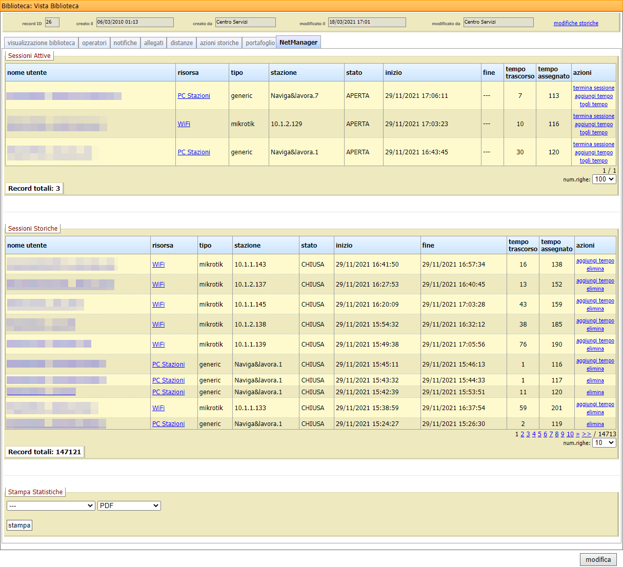 Il pannello Netmanager, visibile dalla Scheda di dettaglio biblioteca, è specifico per ciascuna biblioteca e permette di gestire le connessioni degli utenti, collegati in WiFi o con postazioni fisse.