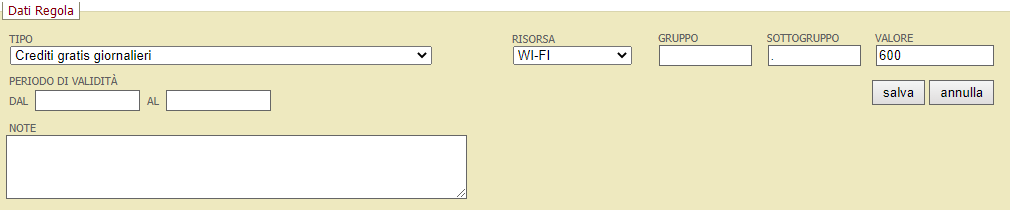 Crediti gratis settimanali: imposta i crediti assegnati a ciascun utente, per settimana. Nel campo valore andranno indicati i minuti totali di navigazione settimanale permessa. La somma dei crediti giornalieri non può superare il valore dei crediti settimanali;