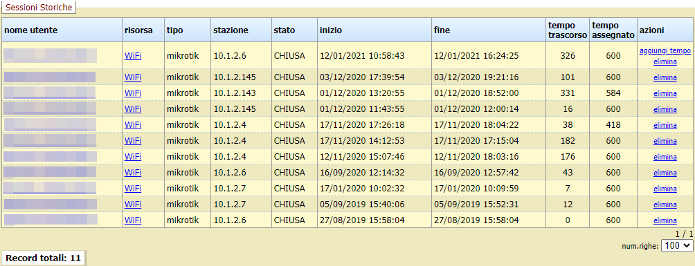 L’elenco delle sessione comprende l’indirizzo IP delle Stazioni, l’intervallo di tempo di attività della sessione, il tempo trascorso e il tempo assegnato in partenza. È possibile eliminare dallo storico una singola sessione cliccando l’azione Elimina.