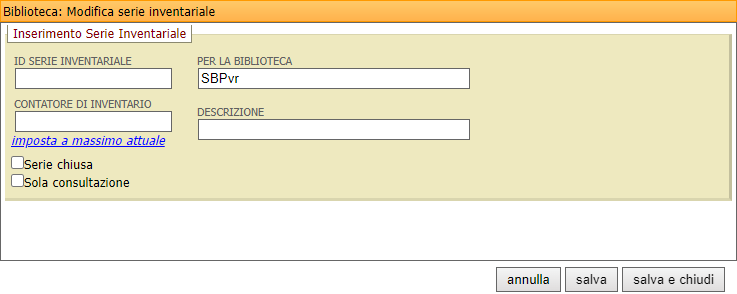 La pagina per l'inserimento di una nuova serie inventariale permette di definire: