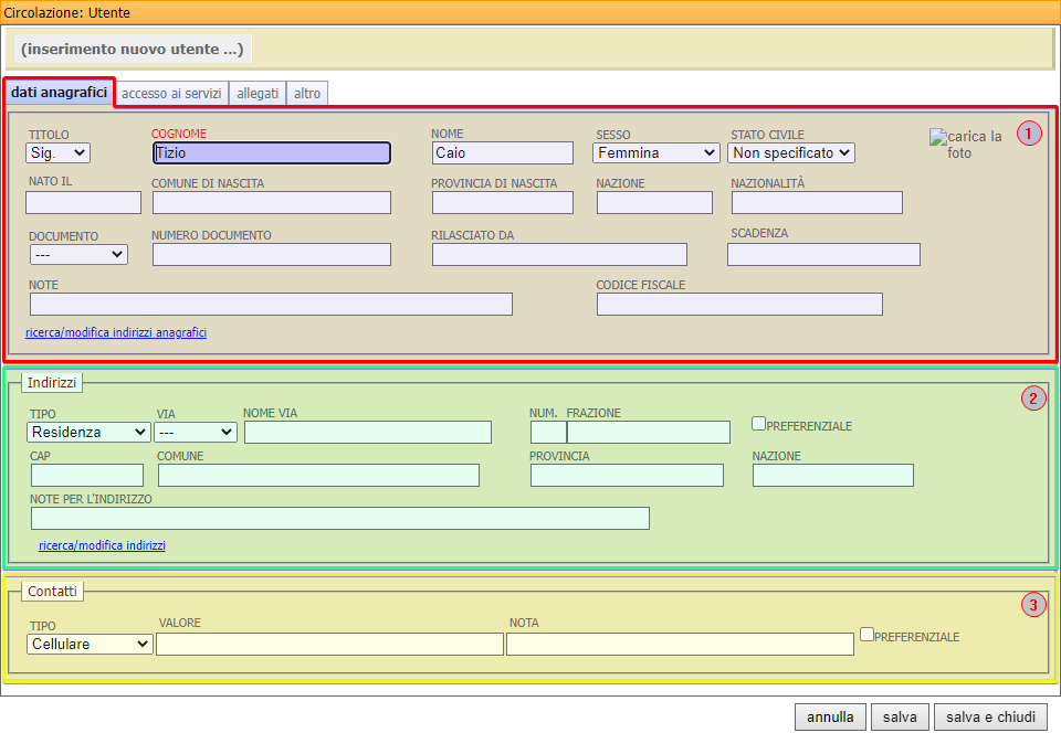 Dati anagrafici: la prima sottosezione porta lo stesso nome della sezione e raccoglie le informazioni anagrafiche dell’utente.