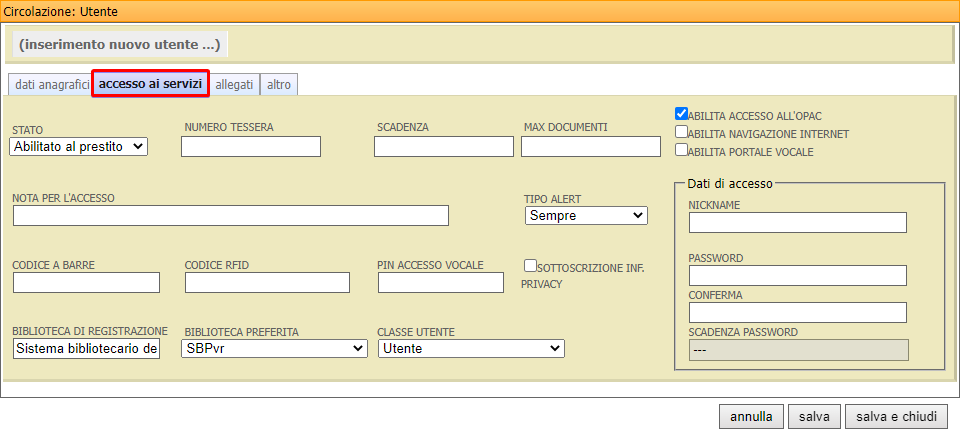 Abilita accesso all'OPAC | Il campo è selezionato in modo predefinito. Se selezionto permette all’utente di accedere ai servizi forniti tramite OPAC (es. prenotazioni). Se non selezionato, l’utente non potrà accedere ai servizi forniti dall’OPAC. |