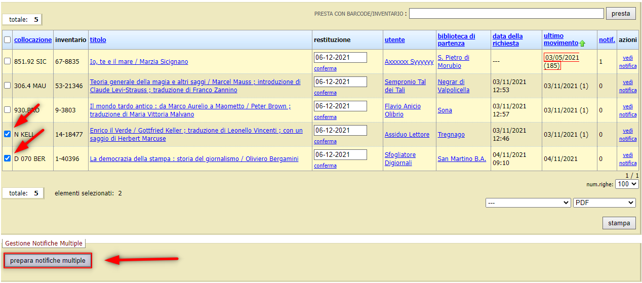 Dalla pagina Pronti al prestito o Prestiti in corso è possibile selezionare più titoli da notificare o sollecitare simultaneamente diversi utenti.