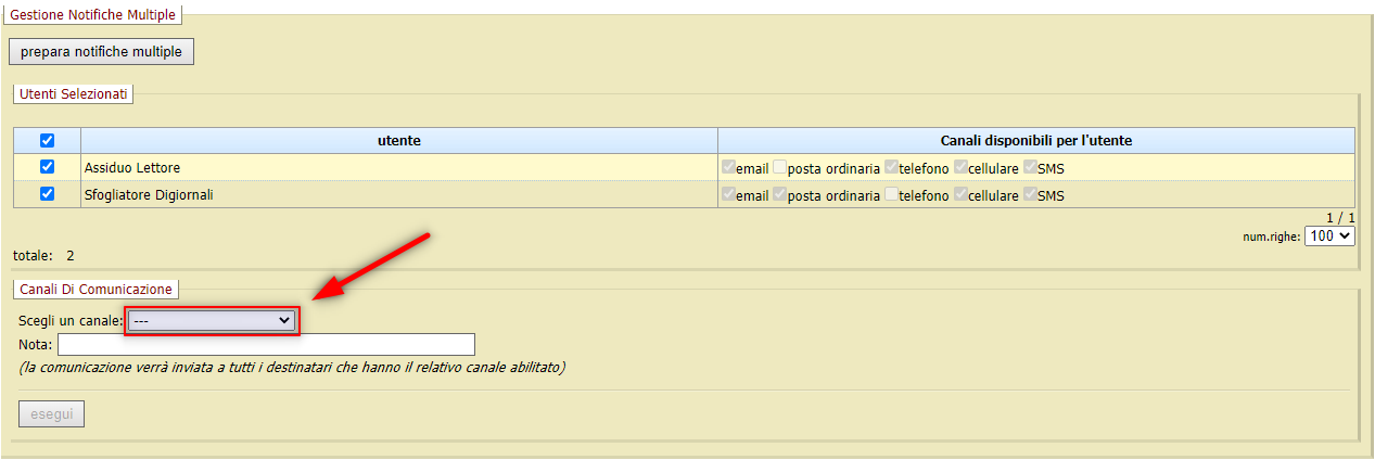 Per eseguire la notifica/sollecito è indispensabile scegliere un canale di comunicazione, quindi cliccare il pulsante Esegui.