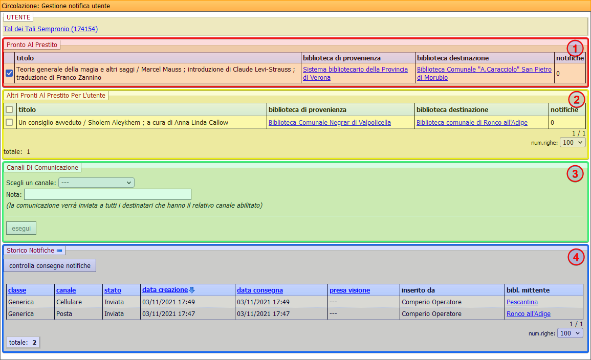 Per l'elenco di tutte le notifiche effettuate da una certa biblioteca, è possibile consultare la pagina Lista notifiche.
