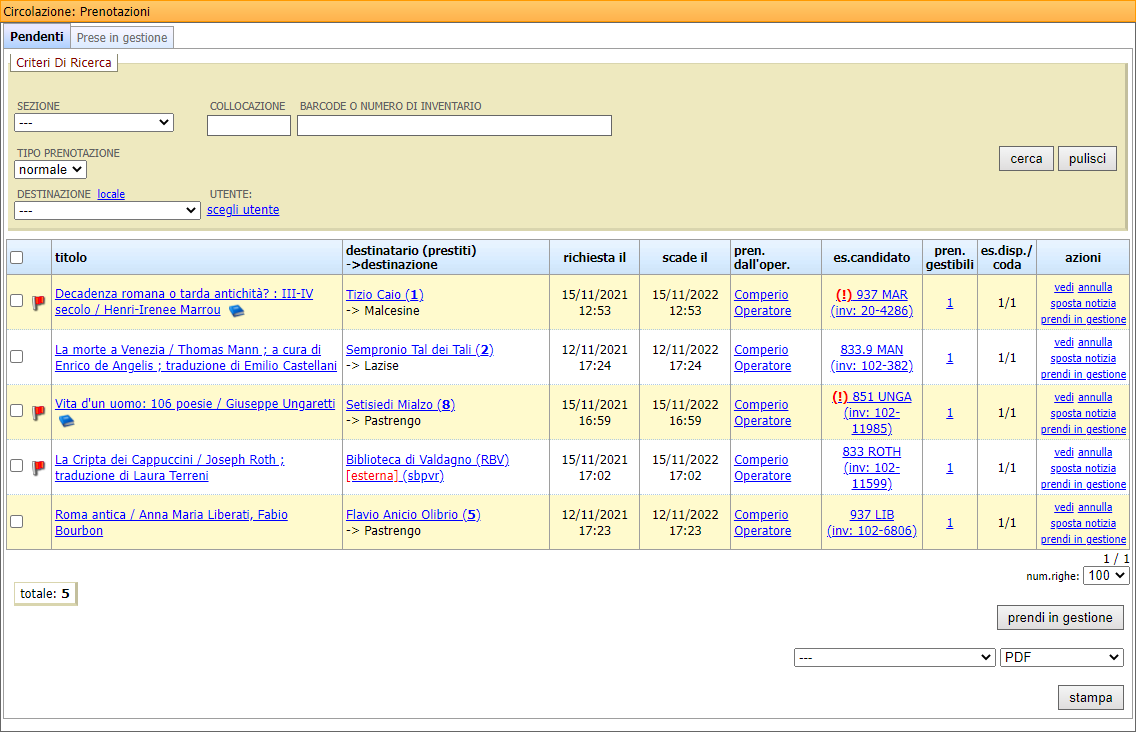 Una prenotazione pendente, per poter essere soddisfatta, va presa in gestione. La "presa in gestione" di una prenotazione comporta la scomparsa della stessa dalla pagina Prenotazioni delle altre biblioteche che sono potenzialmente in grado di soddisfarla, permettendo all'operatore di avere il tempo di recuperare il materiale per poi processarlo. Per questo motivo la pagina è divisa in due aree: le prenotazioni Pendenti e le Prese in gestione.