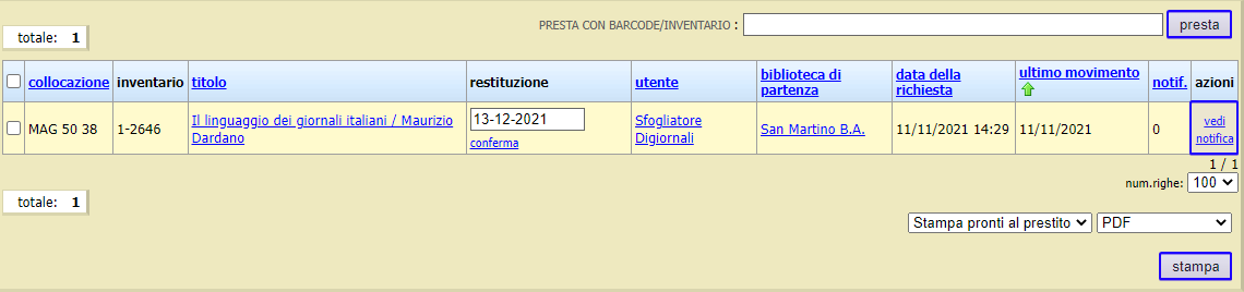 È possibile notificare agli utenti che il loro prestito è pronto per il ritiro, selezionando il link Notifica tra le Azioni disponibili relativo al singolo documento della lista, oppure selezionando più documenti e cliccando il pulsante Prepara notifiche multiple per inviare delle notifiche cumulative.