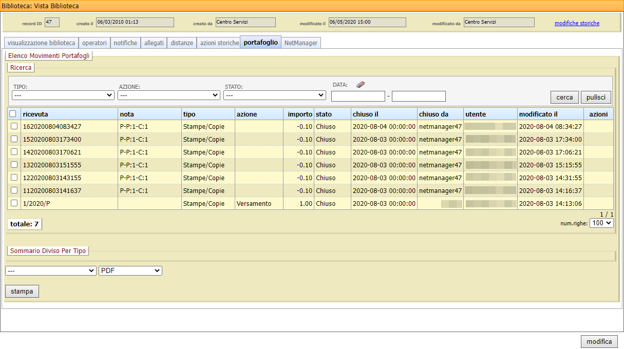 Raccoglie tutte le operazioni monetarie degli utenti della biblioteca. Si possono filtrare i risultati attraverso lo strumento di ricerca, selezionando i menu a tendina Tipo, Azione, Stato e la data dell’operazione.
