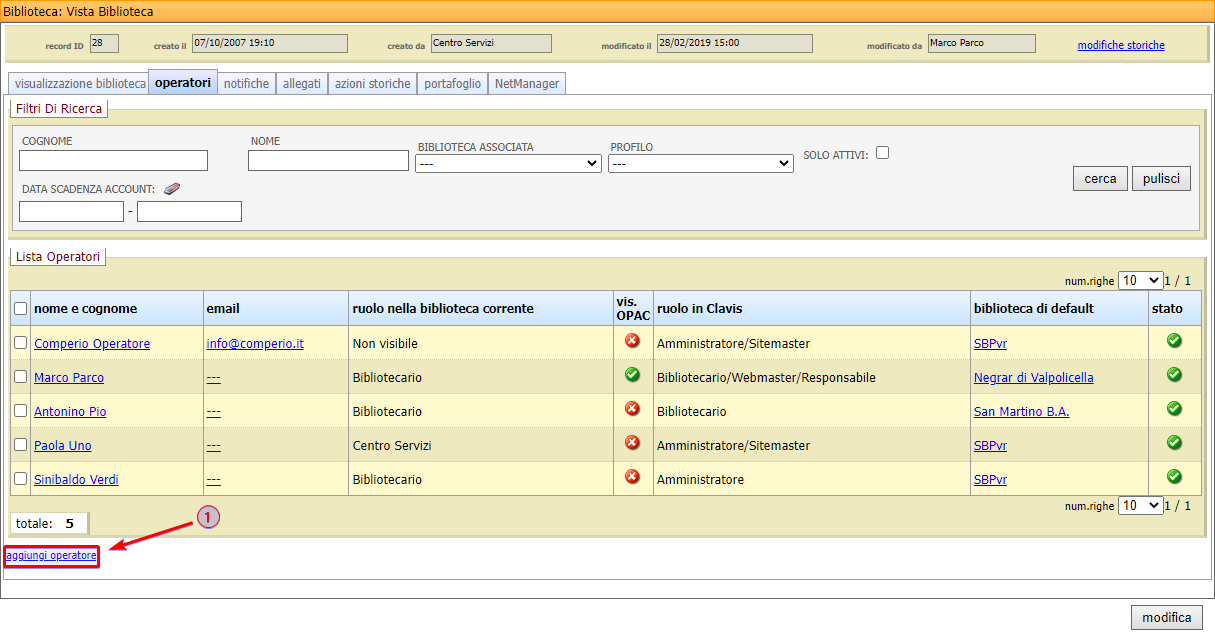 Da questa pagina si può legare un nuovo operatore alla biblioteca, cliccando sul link Aggiungi operatore.