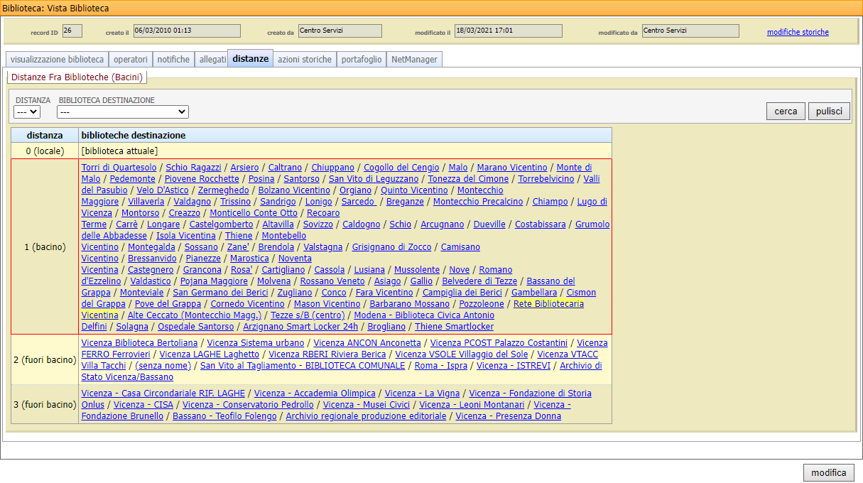 Questa sezione, visibile nel caso sia stata attivata la configurazione per bacini, mostra il rapporto di distanza tra la biblioteca e le altre, raggruppandole per bacini.