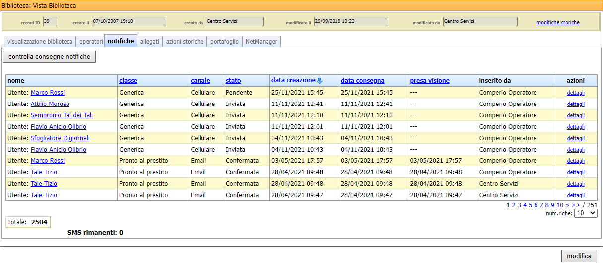 Il contenuto di questa sezione è simile a quello della pagina Lista notifiche, ma filtrato per la biblioteca che si sta visualizzando (ovvero la biblioteca che ha inviato le notifiche).