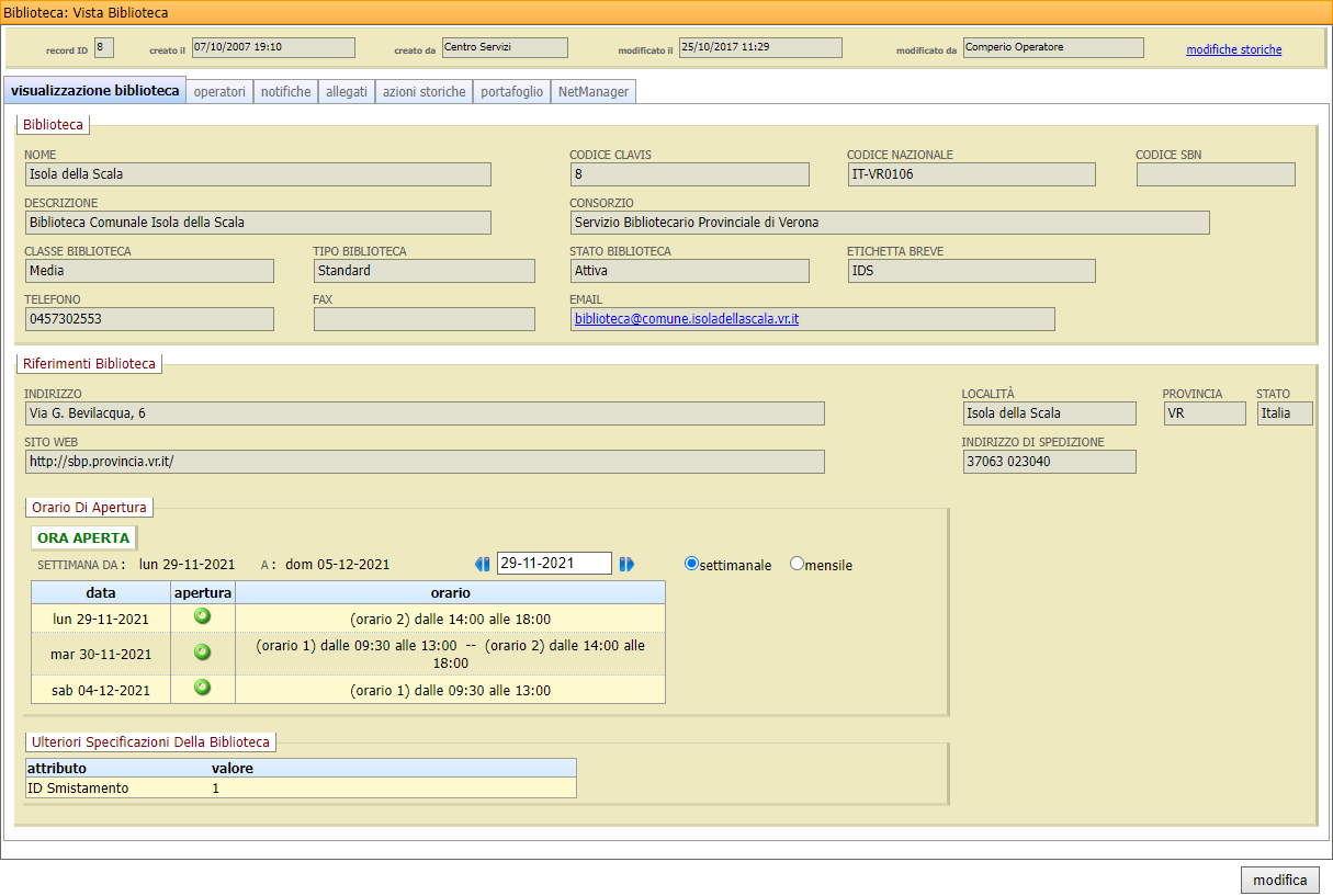 Cliccando il pulsante a piè di pagina Modifica è possibile modificare i dati della biblioteca, l'orario e gli allegati.