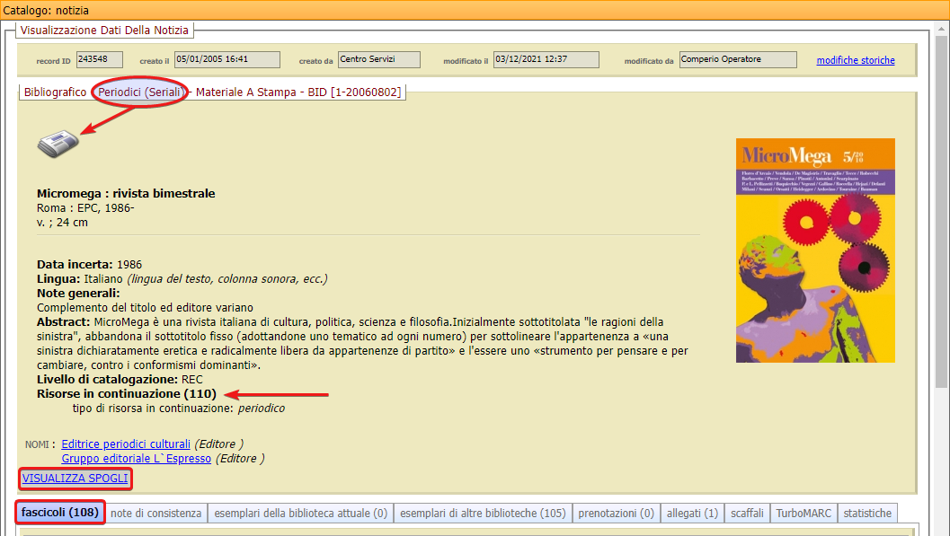 Inoltre, nel caso di Periodici è presente anche la linguetta Fascicoli.