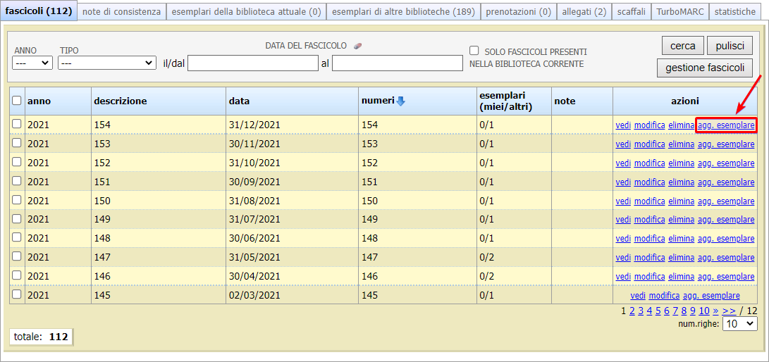 agg. esemplare: permette di aggiungere un esemplare per quel fascicolo nella biblioteca corrente |