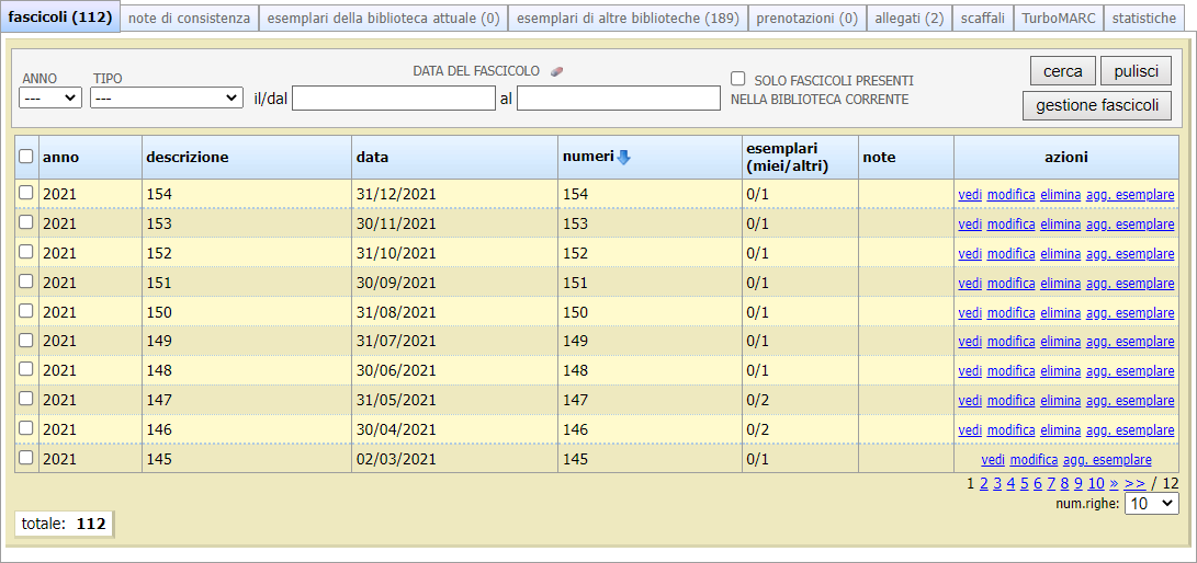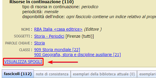 Questa particolare sezione compare solo per il tipo notizia Seriali ed elenca i fascicoli presenti per quel periodico. Tra parentesi, nel titolo della sezione, è riportato il numero complessivo.