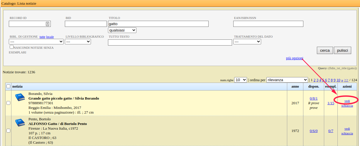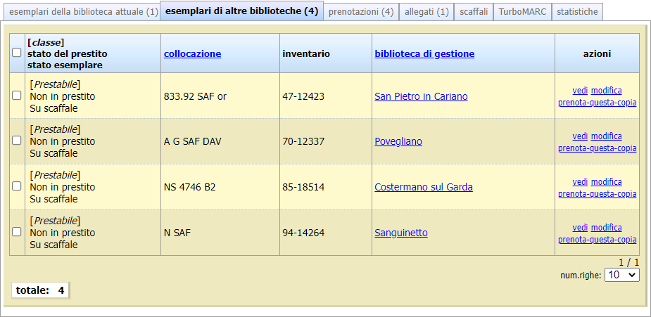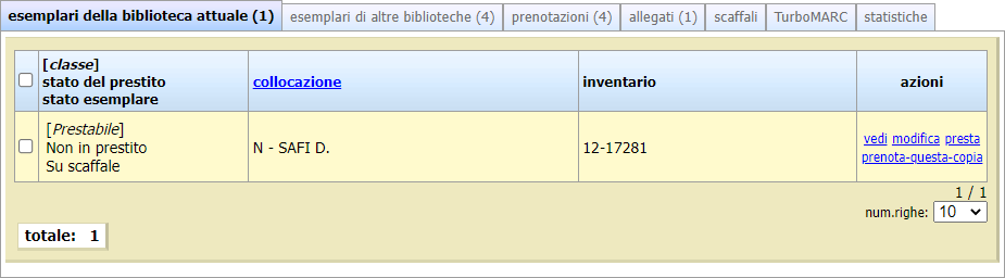azioni | vedi: apre la scheda di dettaglio della prenotazione sull'esemplare | |