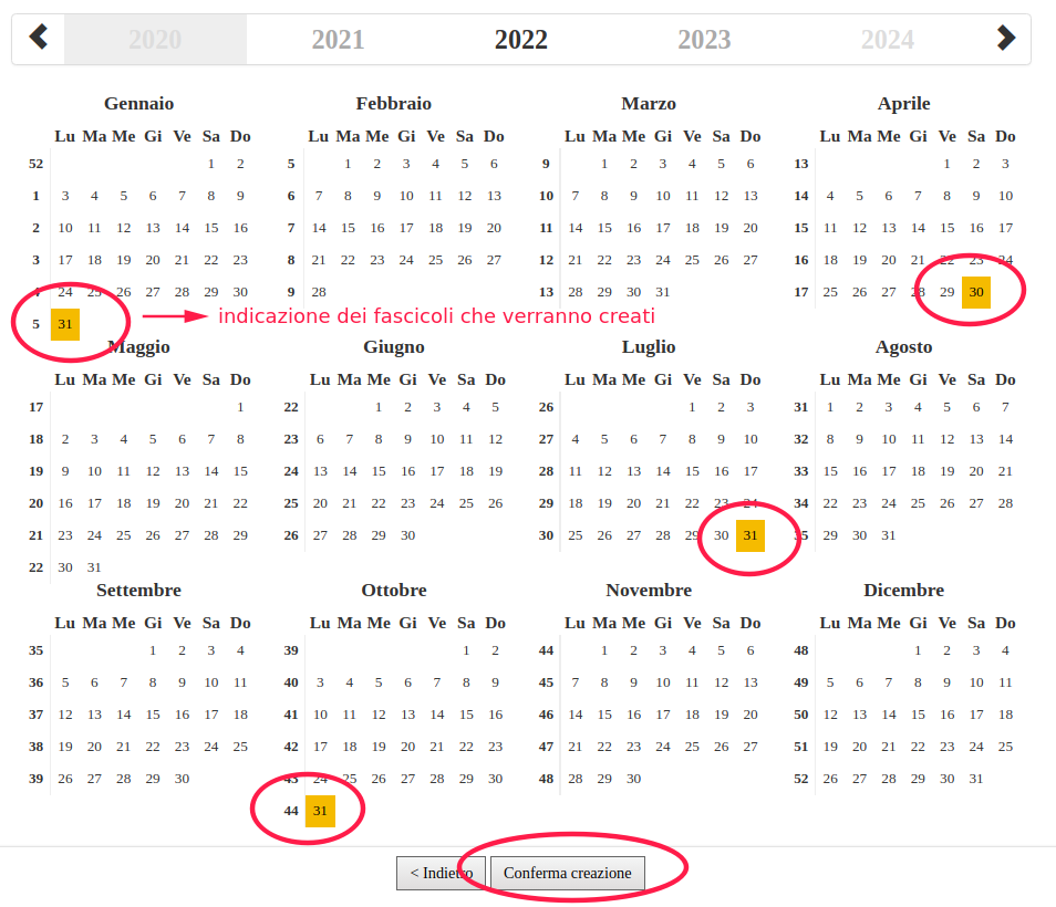 Viene generata un'anteprima dei fascicoli che verranno creati, verificare la correttezza dati e cliccare il pulsante Conferma creazione.