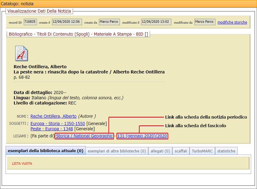 Per informazioni sui singoli campi della scheda e come modificarli, consultare la sezione sulle procedure di catalogazione (Nuova notizia).