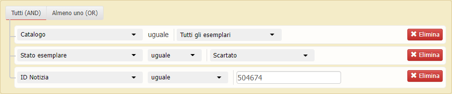 Il pulsante compare solo se alla notizia sono accorpati degli esemplari con lo Stato in Scartato e quindi nascosti nelle due sezioni degli esemplari della biblioteca attuale e di altre biblioteche. Cliccando il pulsante, si viene reindirizzati alla pagina Lista esemplari con i filtri preimpostati per la ricerca di esemplari scartati legati alla notizia in questione.