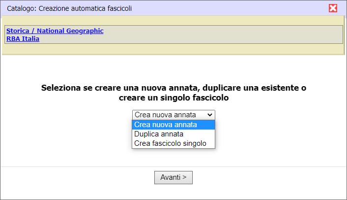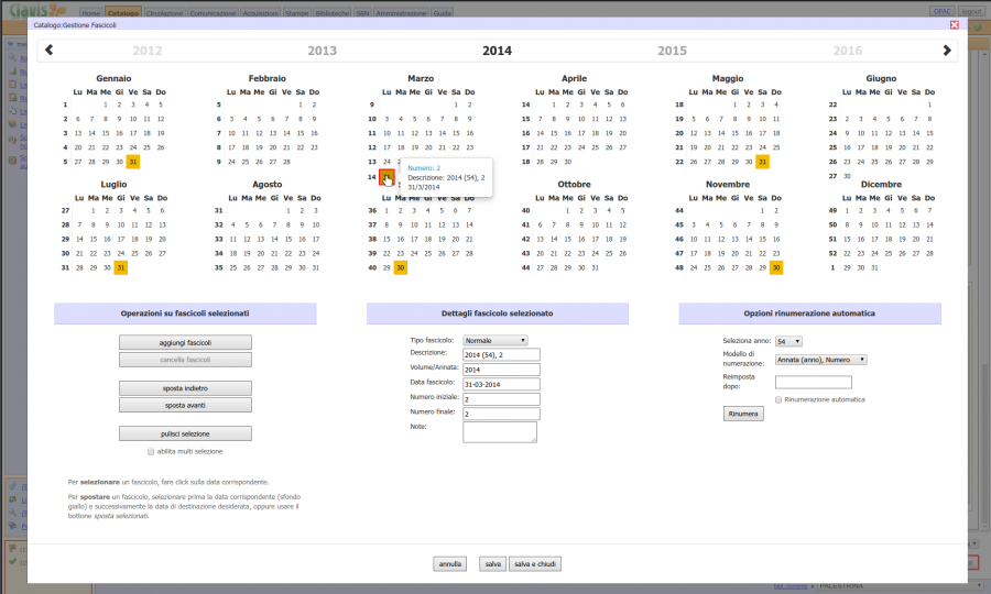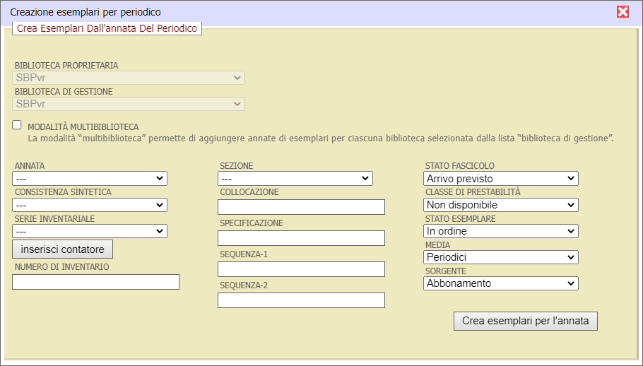 Creazione dell'intera annata di esemplari, permette di creare tutti gli esemplari del periodico che si prevede di ricevere durante l'anno.
