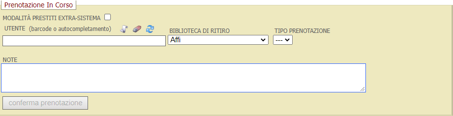 Per effettuare una prenotazione extra-sistema (verso l'esterno) è necessario invece spuntare la casella Modalità prestiti extra-sistema.
