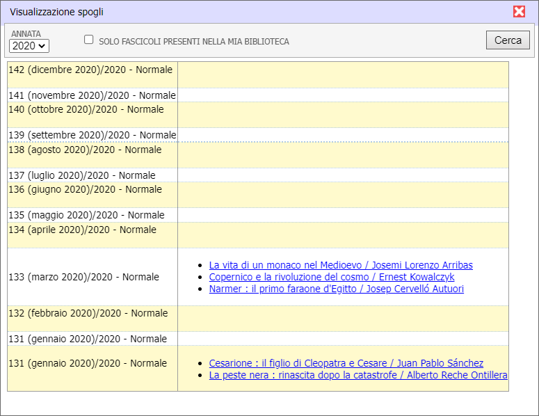 Il link Visualizza Spogli permette di aprire una finestra popup con l’elenco di tutti i fascicoli catalogati per quel periodico.