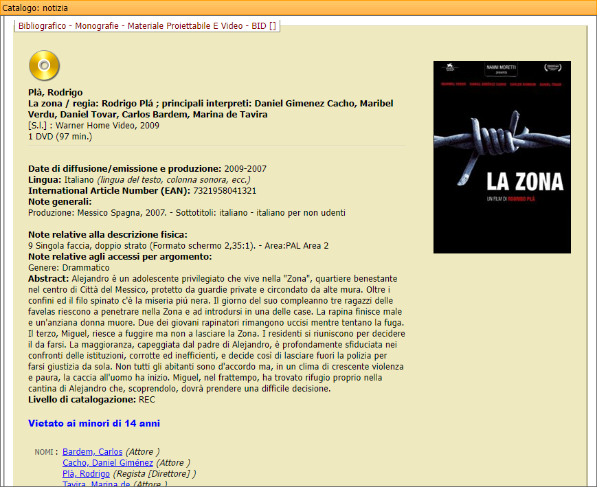 Oltre alle informazioni bibliografiche, la pagina contiene anche l'immagine della copertina e i collegamenti alle voci di authority (nomi, soggetti, classi, ecc.).