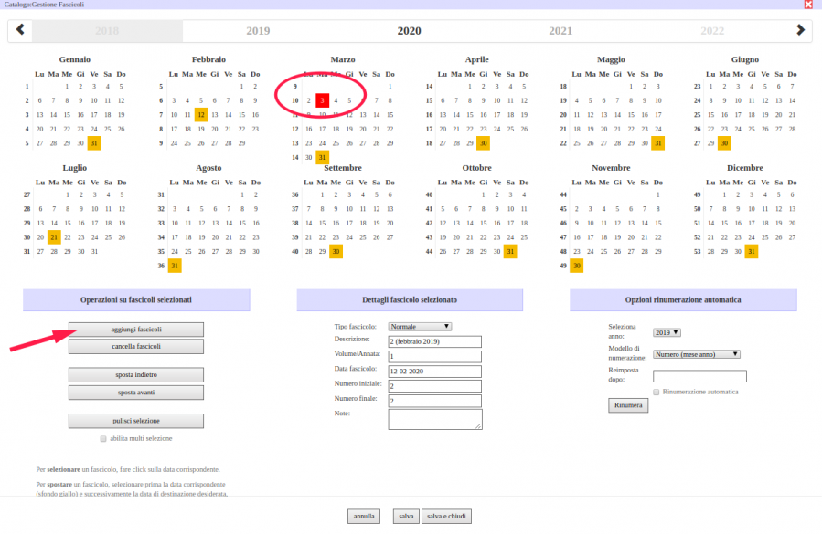 Se si clicca su un giorno privo di fascicoli, il giorno corrispondente diventa rosso (quindi selezionato) ed è possibile aggiungere un fascicolo in quella data cliccando su Aggiungi fascicoli.