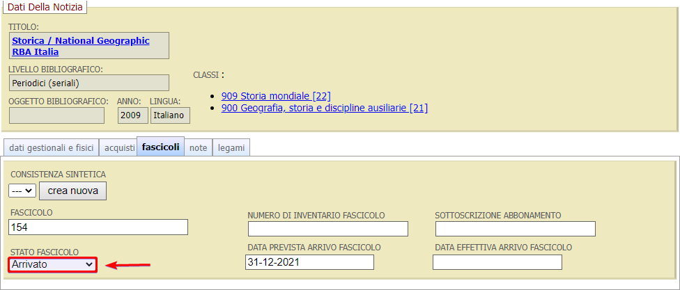 Si possono selezionare gli stati che si vogliono associare agli esemplari (Arrivato, Prossimo arrivo ecc.). Se si creano i fascicoli ad inizio anno (prima che arrivino) si deve assegnare uno stato Arrivo previsto.