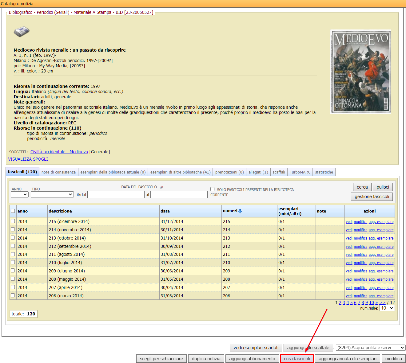Tra le azioni presenti nella pagina di dettaglio di una notizia di tipo Seriali (periodici e collezioni), è presente la possibilità di creare dei fascicoli del periodico.