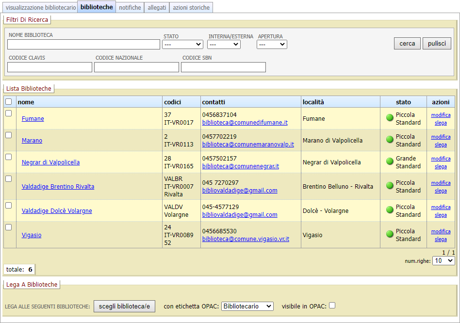 La sezione Biblioteche permette di visualizzare l'elenco di biblioteche a cui è legato l'operatore. È possibile filtrare le biblioteche utilizzando alcuni parametri di ricerca; inoltre per ogni biblioteca collegata è possibile modificarne le informazioni cliccando l’azione Modifica, oppure slegare l'operatore cliccando l’azione Slega. Le azioni Modifica e Slega sono disponibili solamente se l’operatore corrente è abilitato ad operare per le biblioteche della riga corrispondente, oppure se ha un profilo di tipo amministratore.