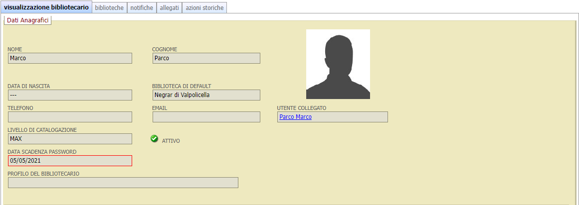 Nel campo Profilo del Bibliotecario è possibile vedere nota biografica a testo libero per l’operatore.